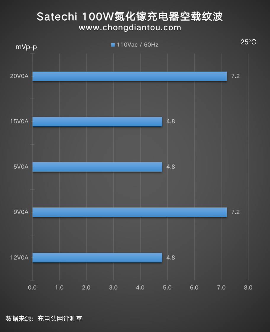 充電器在110V 60Hz交流輸入的情況下進行了空載與重載的紋波測試,測試結果如下: