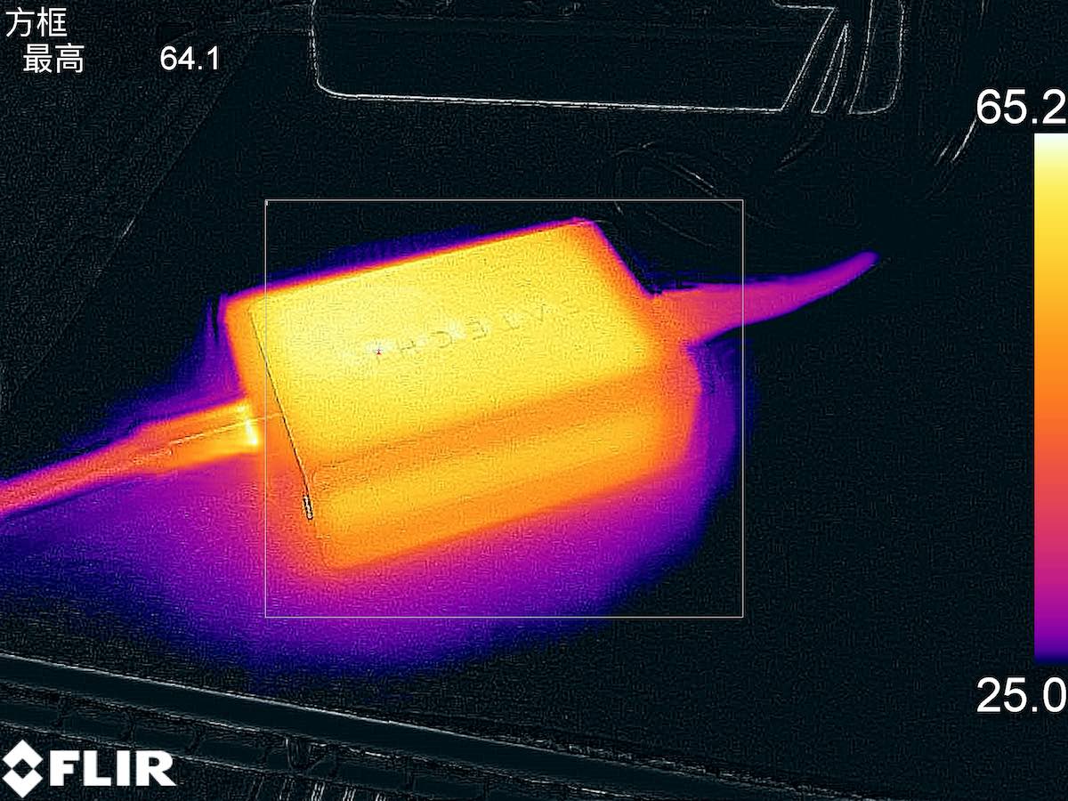 以20V5A 100W的充電功率持續輸出1小時后采集到充電器的溫度為64.1℃,溫升41.7℃。