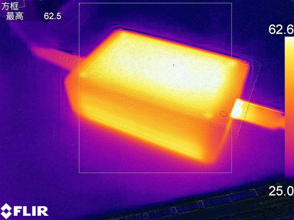翻轉至另一側,充電器的最高溫度為62.5℃,溫升40.1℃。