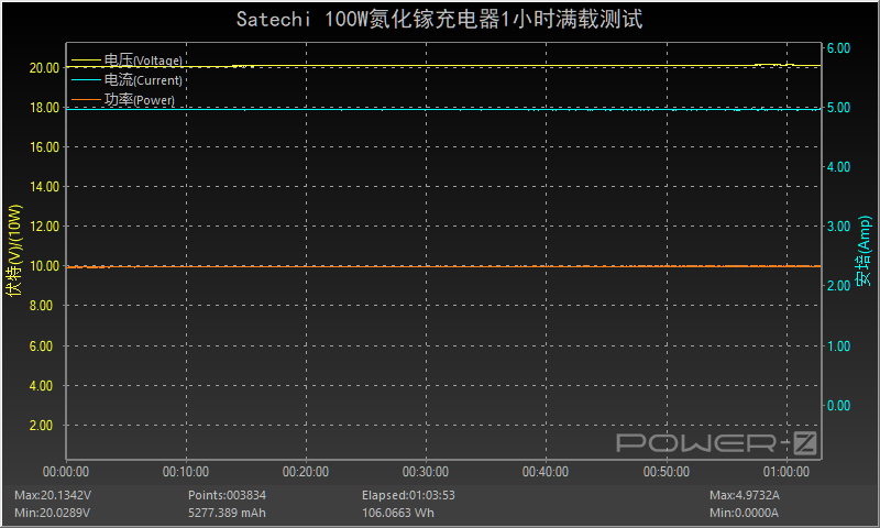 按照額定功率20V5A 100W滿載對充電器進行穩定性測試,測試時間為一小時,測試過程中電壓值呈水平直線,無明顯波動情況,長時間滿載也可以穩定輸出。