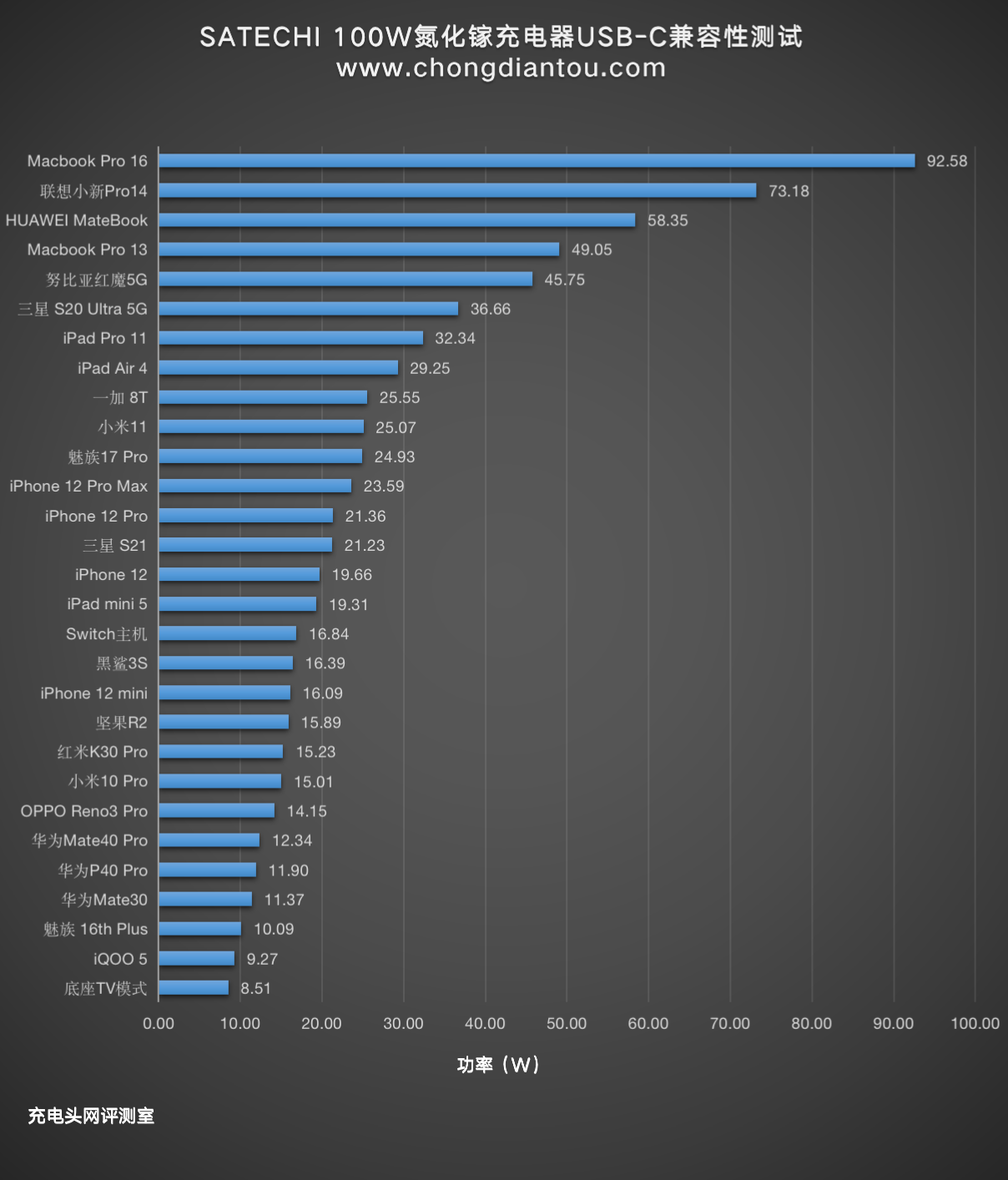 從柱狀圖上看,筆電的充電功率自然最高,MacBook Pro 16達到了92.58W,其他設備的充電功率處于正常水平,整體走向較為平緩。