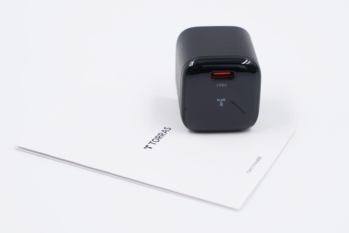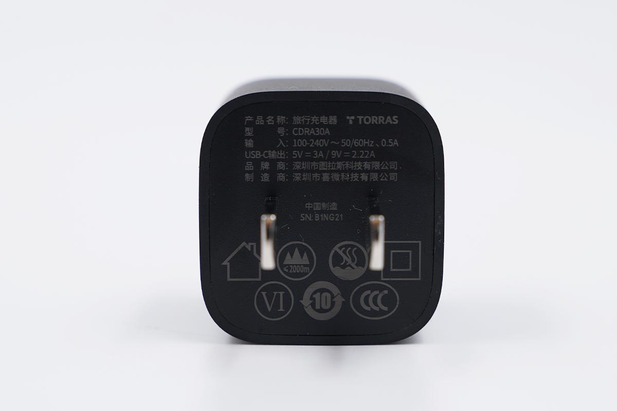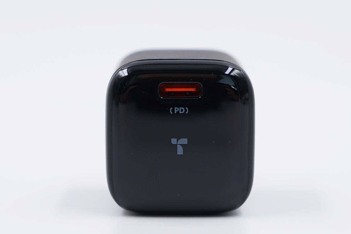 接口部分為單USB-C物理輸出接口設計,下方的PD標識也證明了充電器支持PD快充,中間還可以看到圖拉斯的品牌Logo。