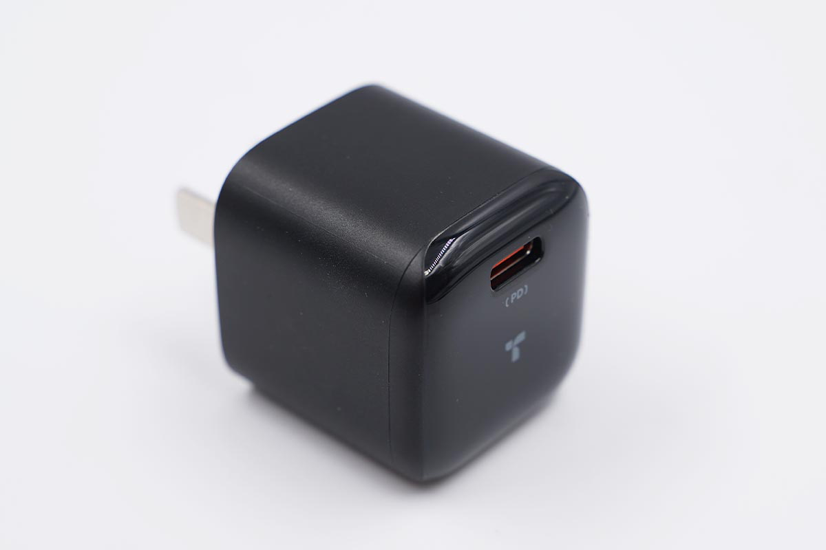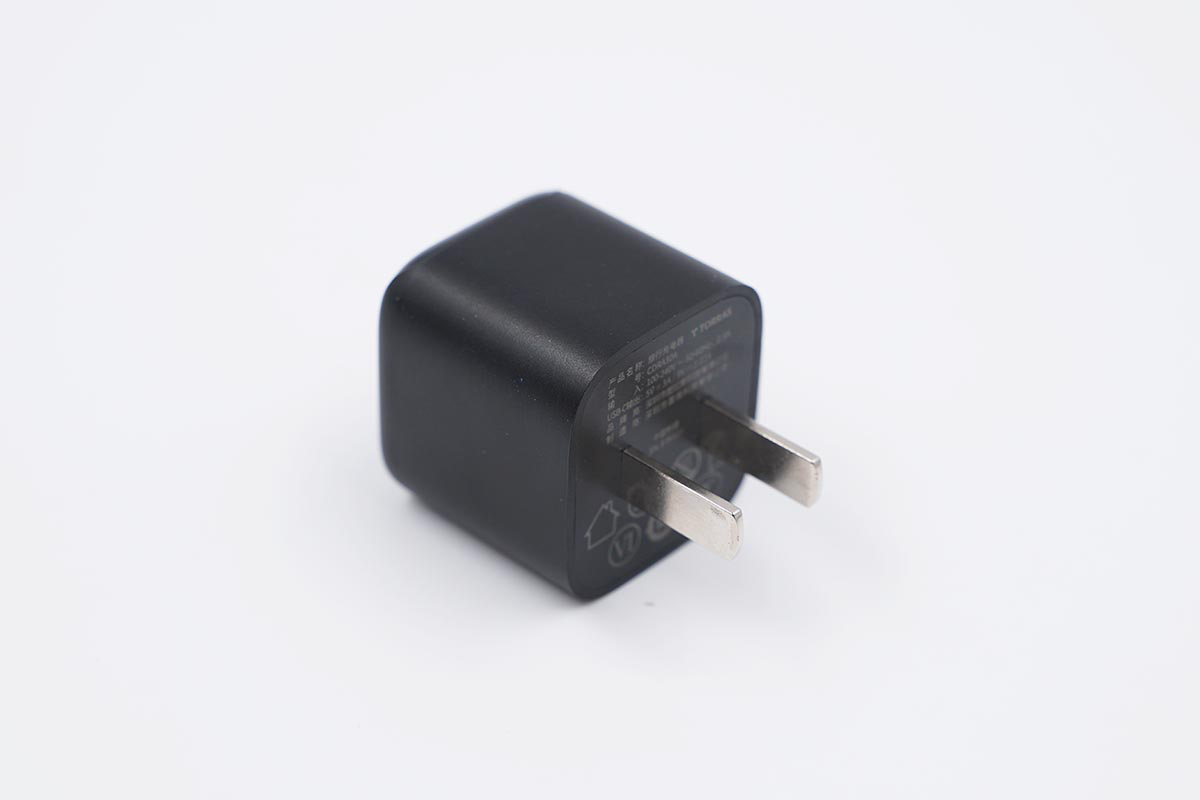 圖拉斯20W PD充電器通體磨砂黑加亮黑的外觀配色,整體機身小巧,插腳采用不可折疊的設計,充電器采用單USB-C物理輸出接口設計,支持物理正反盲插操作。