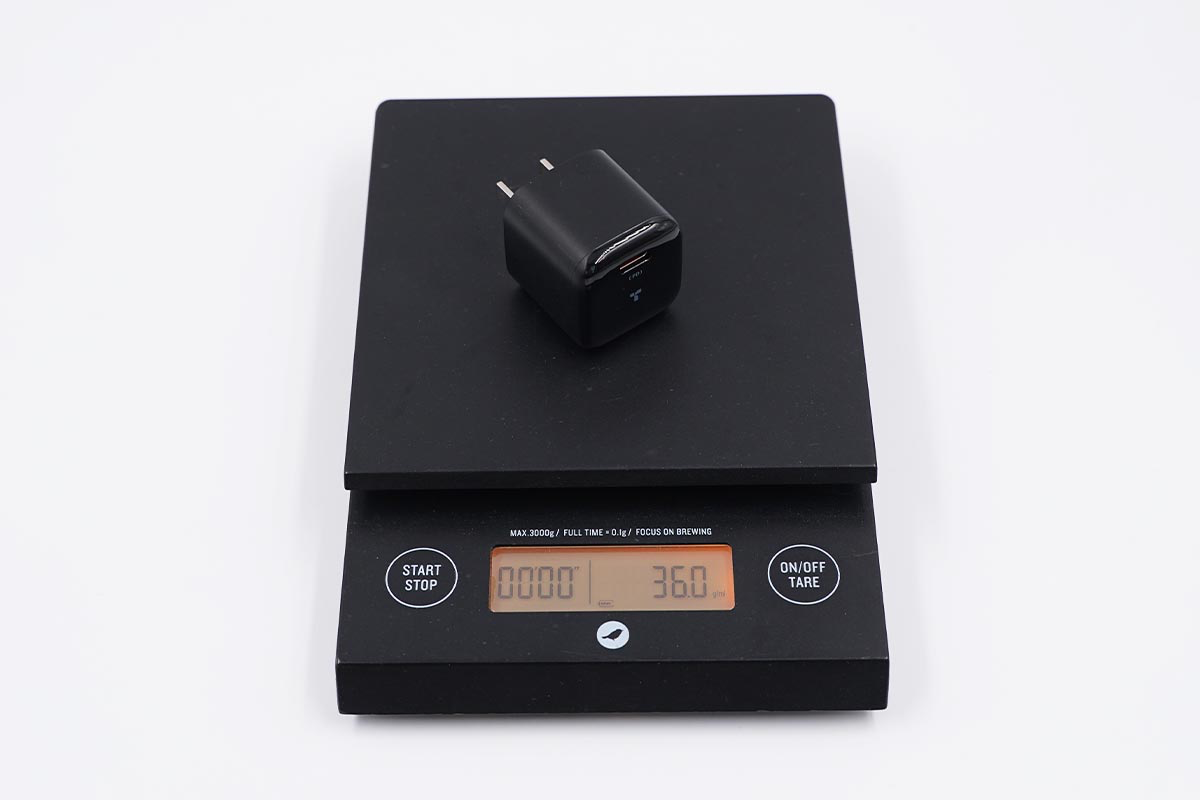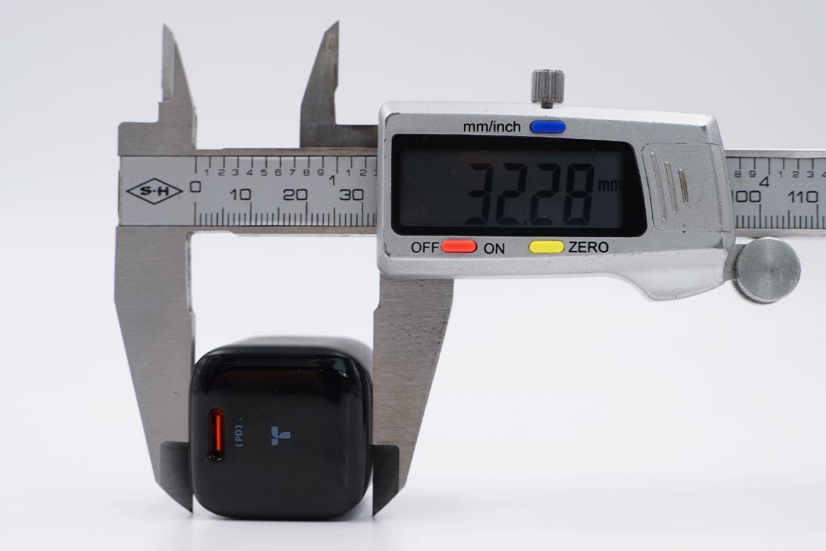 充電器的三維參數為30.91x30.71x32.28mm,充電器的體積約為30.64cm3,以最高輸出20W計算,功率密度約為0.65W/cm3 。