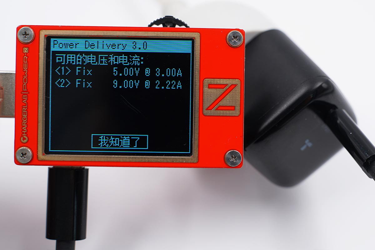 讀取充電器的PDO報文,實測支持5V3A、9V2.22A兩個固定輸出電壓檔位,和參數中標稱的相同。
