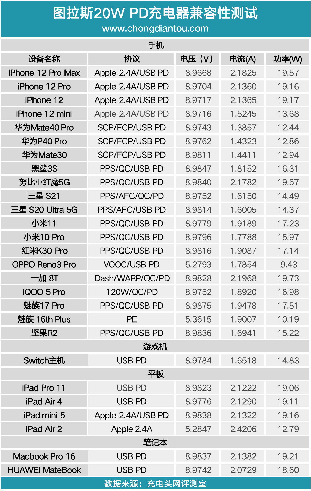 將測試數據匯總成表,對于絕大多數設備來說均可以觸發(fā)9V PD快充檔位,為手機、Switch掌機和iPad等設備均可以提供快充服務。