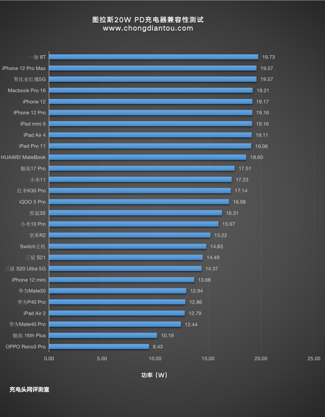 整個柱狀圖的走向較為平緩,功率最高的為一加8T,為19.73W,OPPO Reno3 Pro功率最低為9.43W。