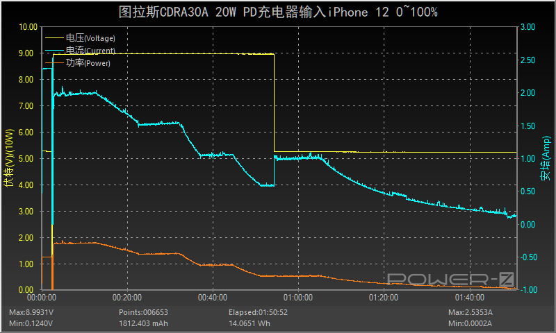因為圖拉斯的這款20W PD充電器對標的是iPhone 12用戶,所以筆者還采集了為iPhone 12充電全程的數據。在前期經歷了短暫的關機充電之后手機開機,電壓上升到9V快充輸入,約12分前功率、電壓電流平臺均持穩(wěn)定的輸入狀態(tài),隨后功率和電流呈階梯式的下降狀態(tài),并且出現了三個充電平臺,54分后電壓從9V降至5V輸入,功率在5W左右維持了約10分鐘,隨后功率和電流逐漸下降直至充電結束,全程耗時約1小時48分,最高功率為8.95V 2.09A 18.74W。