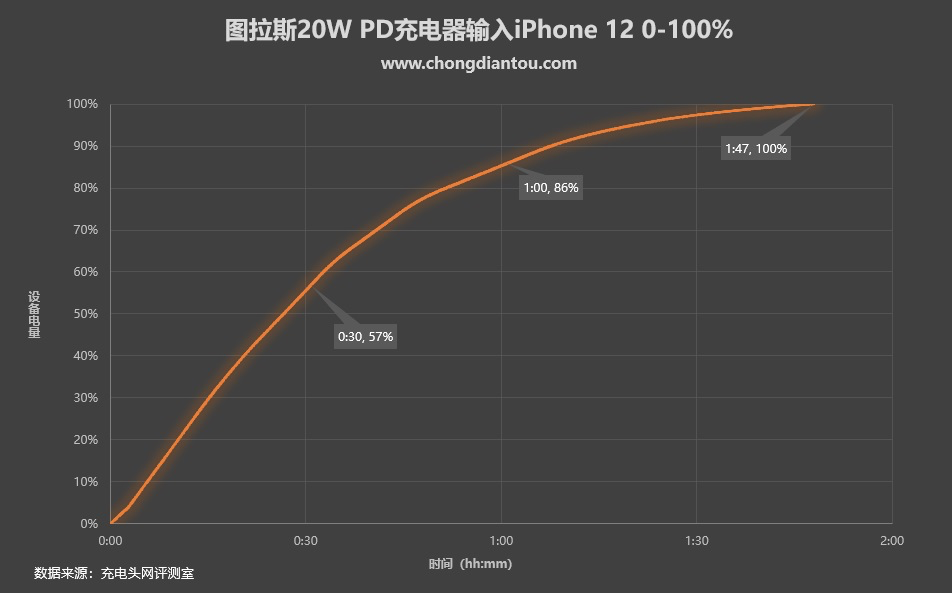 將測試數據繪制成曲線圖,可以看到圖拉斯20W PD充電器半小時為iPhone 12充電57%,1小時充電86%,完全充滿需要1小時47分。