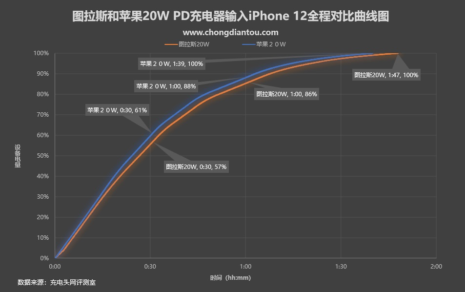 此外筆者還將蘋果20W充電器的測試數據加入了進來,可以看到兩條曲線的軌跡幾乎相同,圖拉斯20W PD充電器在充電速度上和蘋果原裝20W充電器差不多。