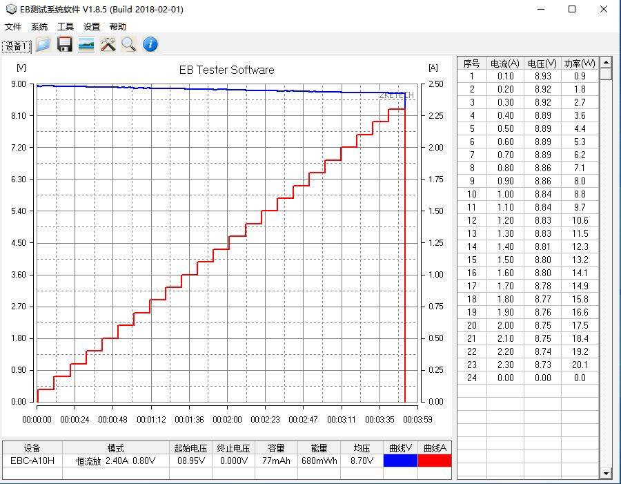 使用EB程控電子負載測試充電器的最大輸出功率,以0.1A為電流步進幅度,10秒為時間間隔,最終錄得最大輸出為8.73V 2.30A 20.1W。