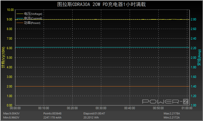 按照額定功率9V 2.22A 20W滿載對充電器進行穩(wěn)定性測試,測試時間為一小時,測試過程中電壓值呈水平直線,無明顯波動情況,長時間滿載也可以穩(wěn)定輸出。