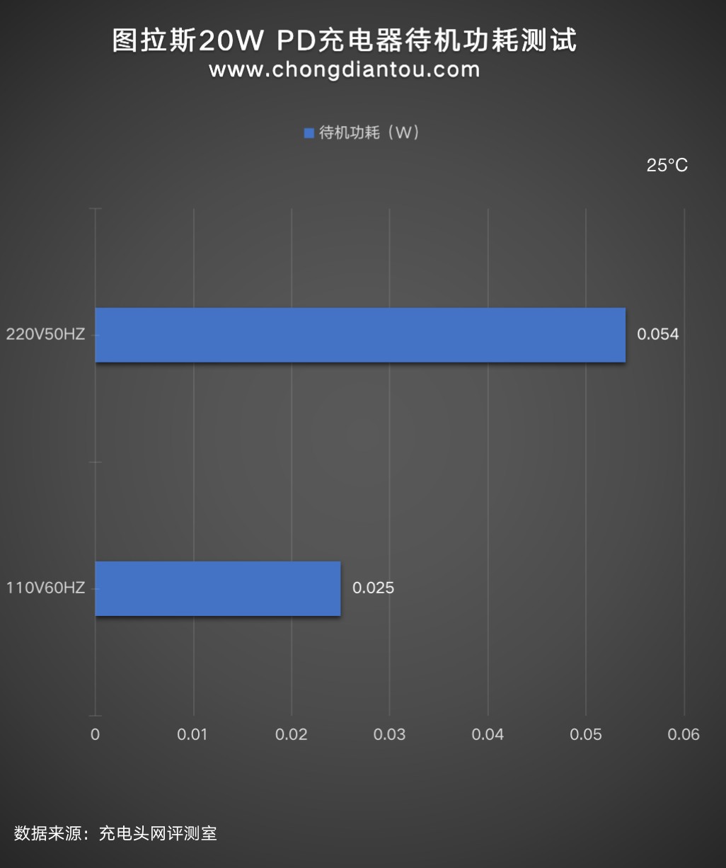 經過功率計測試,圖拉斯20W充電器在220V 50Hz的空載功耗為0.054W,換算下來一年損耗的電能約為0.47KW·h,若市價電為0.6元/KW·h,則充電器一年的空載功耗約為0.28元左右。