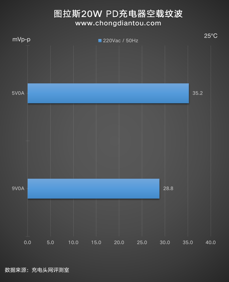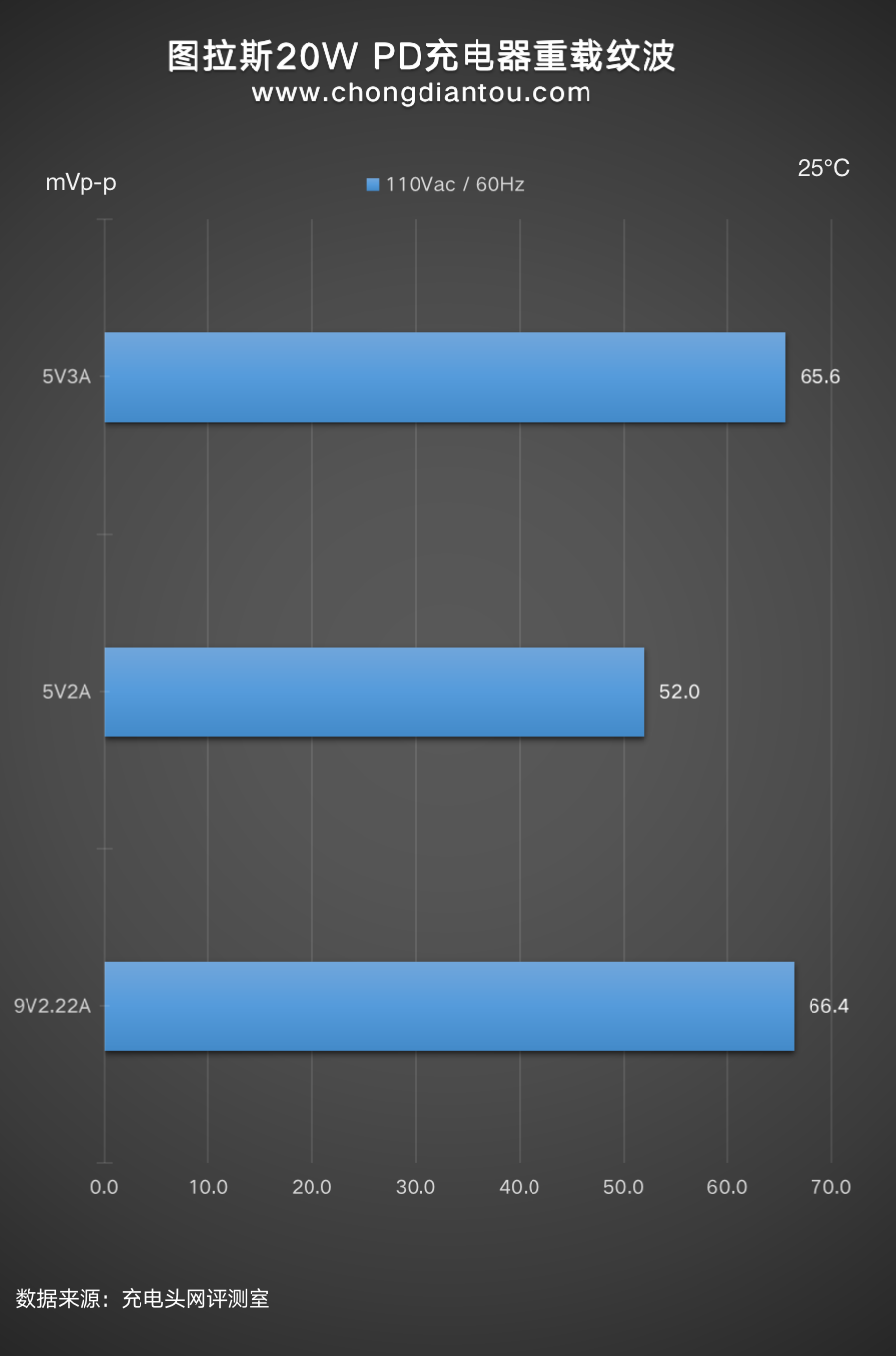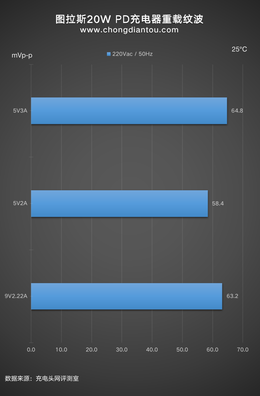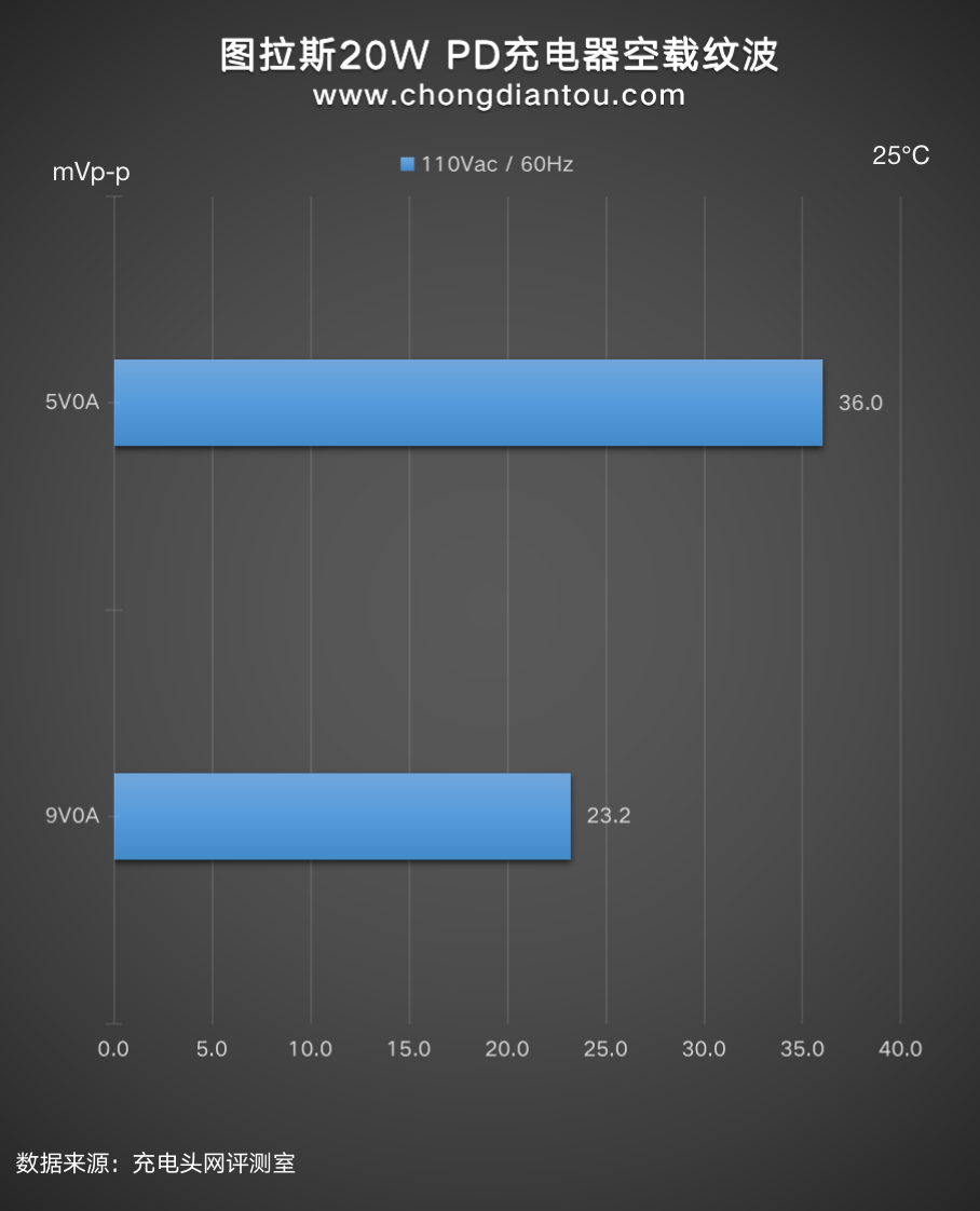 國家標準中充電器紋波要求是不高于200mVp-p,圖拉斯20W充電器在110V 60Hz、240V 50Hz輸入電壓下,所有輸出功率紋波峰峰值均低于200mVp-p這個標準很多,表現不錯。