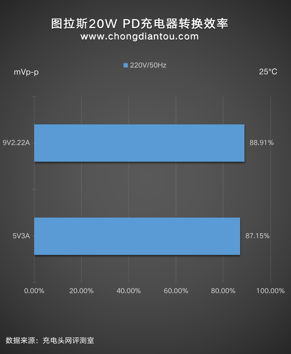 220V 50Hz下,將圖拉斯20W充電器在各個電壓檔位的輸出功率拉滿進行測試:兩個檔位測得插線板AC端輸入功率和USB端輸出功率,通過計算,可得充電器的轉換效率從87.15%到88.91%不等。