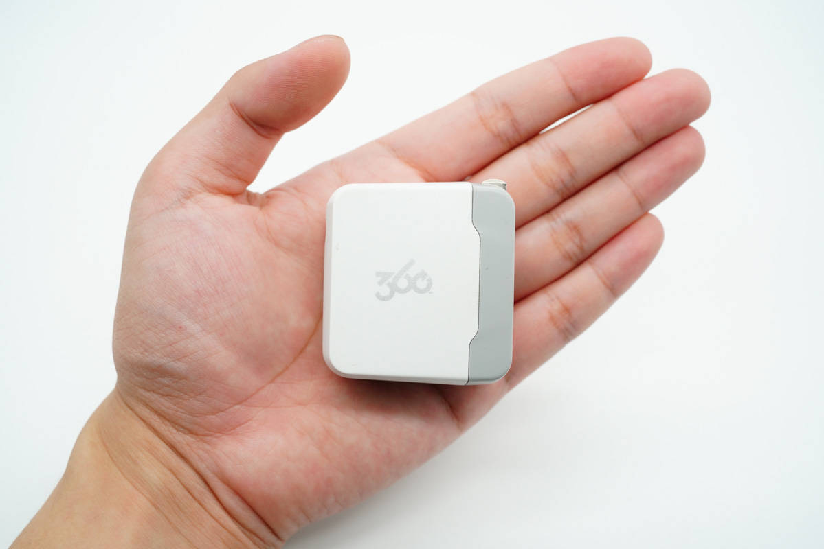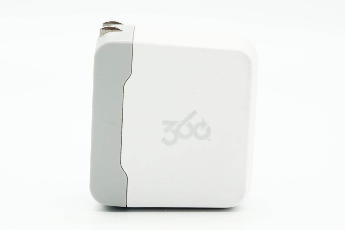 充電器采用梯形造型設計,上窄下寬,輸入端機身殼為灰色,另一部分外殼則為白色,機身殼上印有360字樣,整體設計十分有特點。