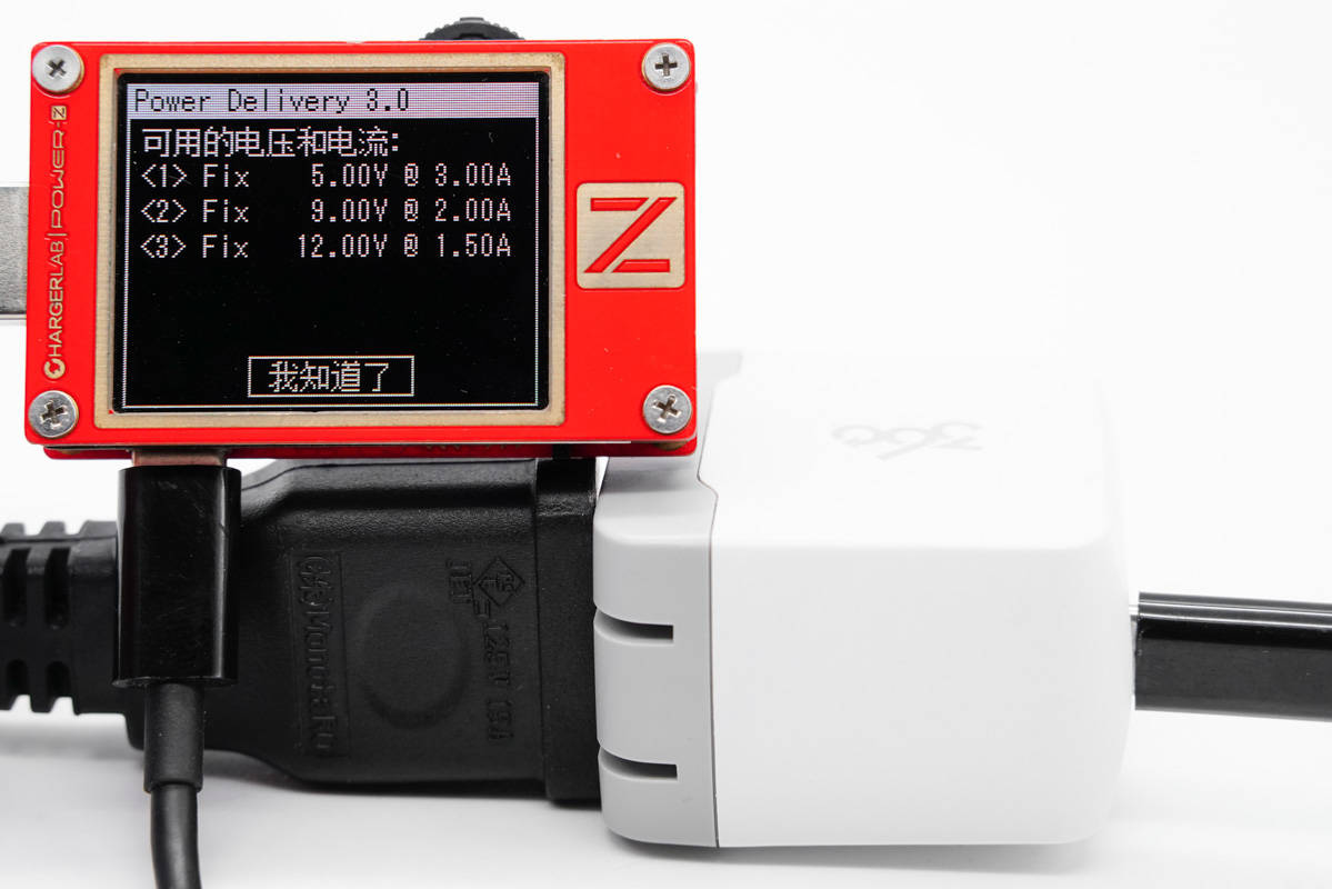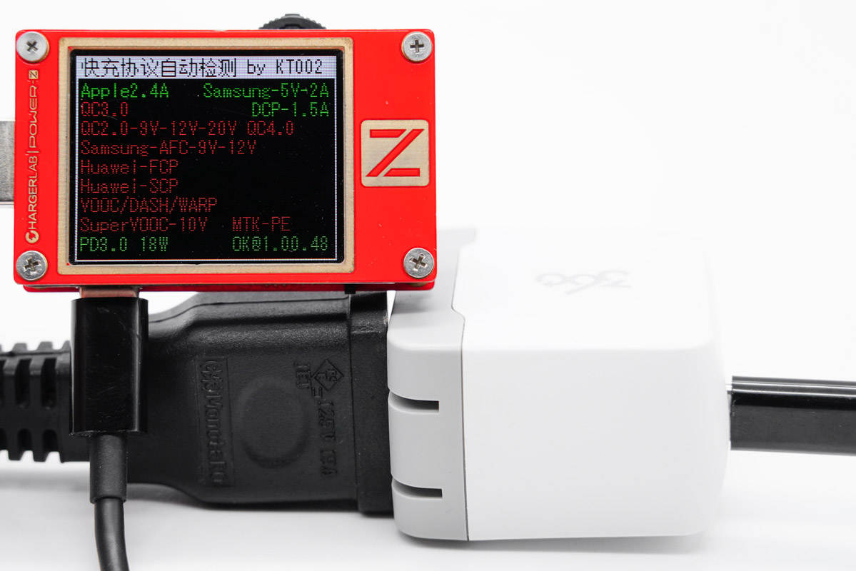 使用ChargerLAB POWER-Z KT002測得USB-C口支持Apple 2.4A、Samsung 5V2A、DCP協議,以及PD3.0快充協議。