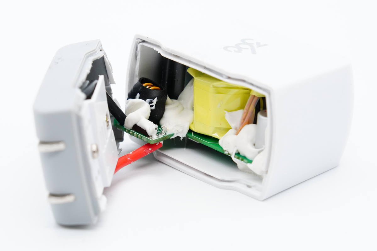 充電頭網通過拆解了解到,充電器初次級元器件布局層次分成清晰,并且都打膠處理,輸出端小板還套上塑料殼加固和隔離。充電器采用達邇AP39303+APR34709高集成18W快充方案,協議芯片采用耕源CY2332,研吉提供的這整套方案下來,充電器整合度大幅提升進而簡化降低整體系統成本,進一步提升產品競爭力。此方案亦可滿足20至22.5W輸出功率,也可支持PPS功能。
