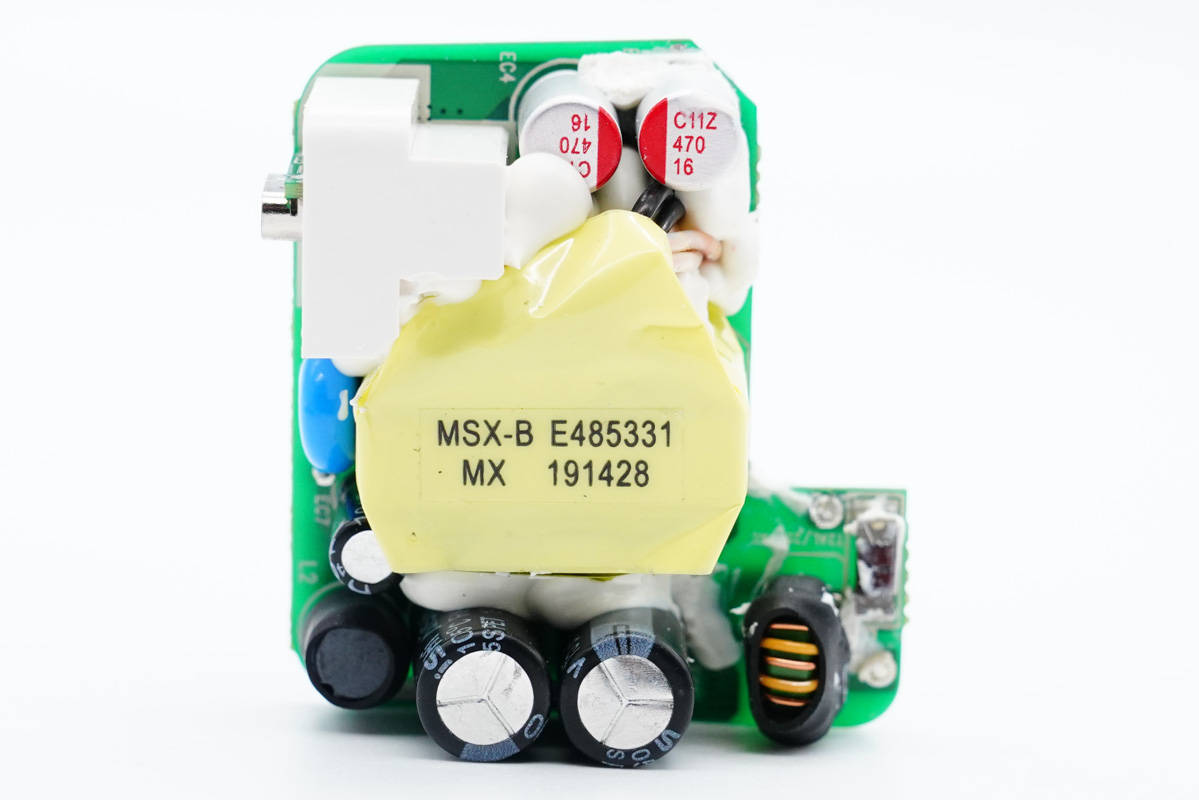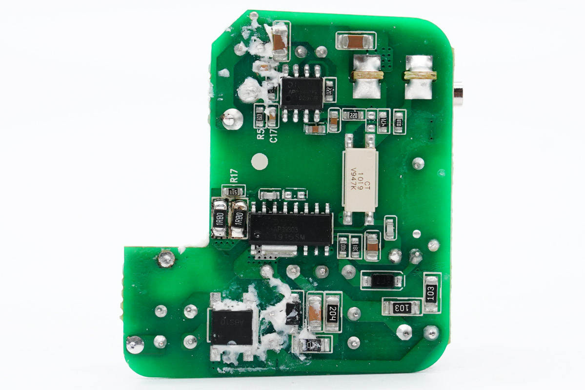 PCB板背面設有整流橋、主控芯片、光耦和同步整流芯片,初次級分界明顯,方案高度集成,電路十分精簡。