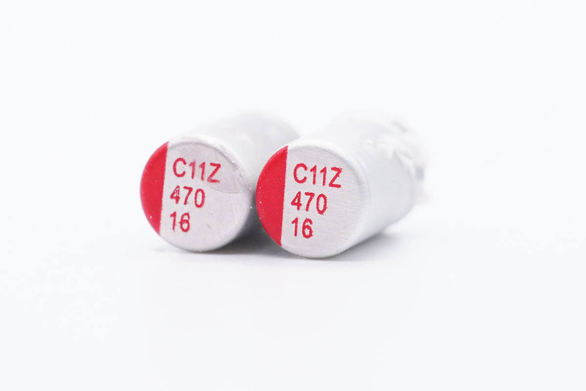 兩顆輸出濾波固態電容特寫,規格均為16V 470μF。