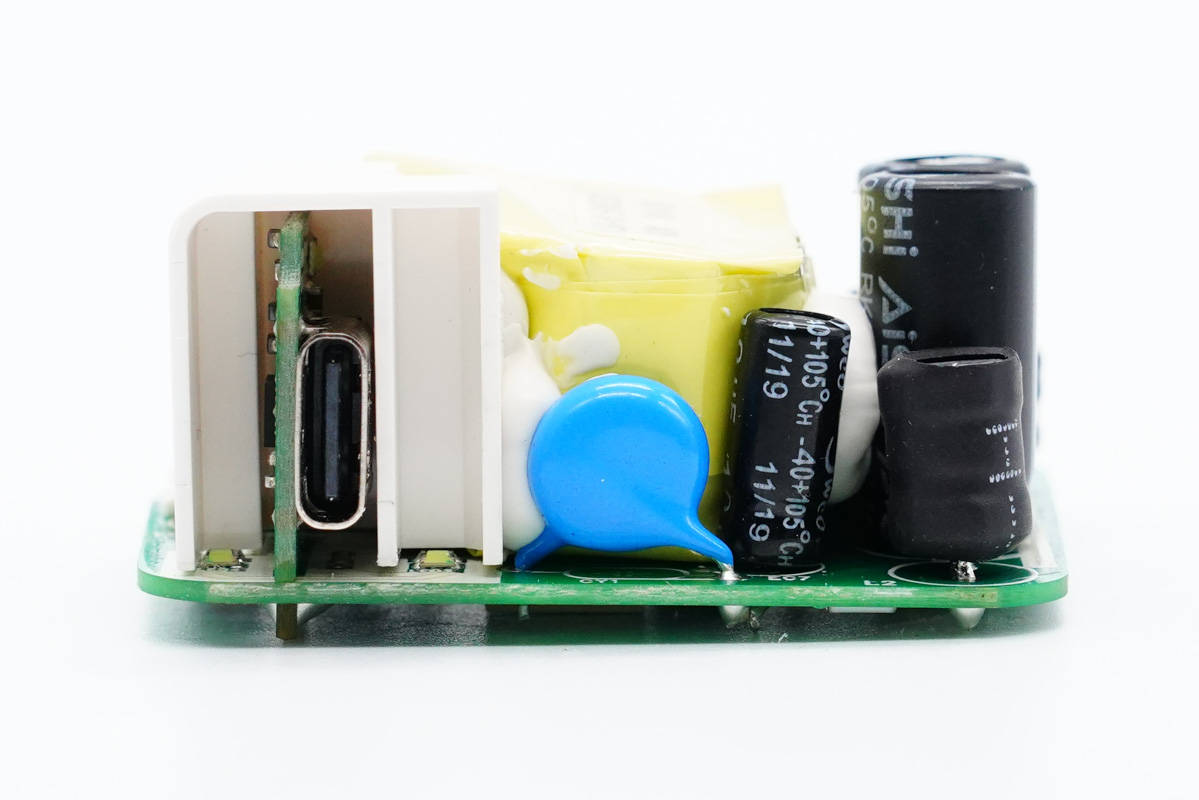 PCB板正面一覽,變壓器以及輸入輸出濾波電容均打膠加固,輸出端USB母座外套塑料殼。