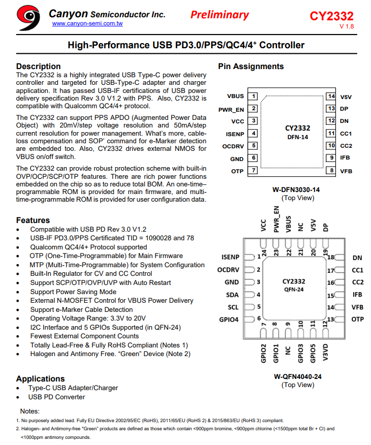 協議芯片采用耕源CY2332,有適用于一般應用的小封裝DFN-14 及適用于多口應用的QFN-24 (含I2C 通訊功能)封裝。CY2332基于解碼器的MCU,通過I2C功能連接其他有I2C功能的產品, 以達成智能分配功率的效果, 而無需再外掛單芯片機處理。