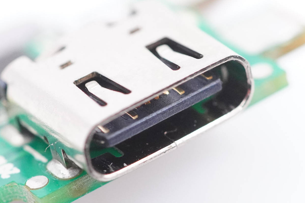 輸出頂面USB-C口黑色膠芯不露銅,接口采用青綠色塑料環裝飾,下方印有PD字樣。