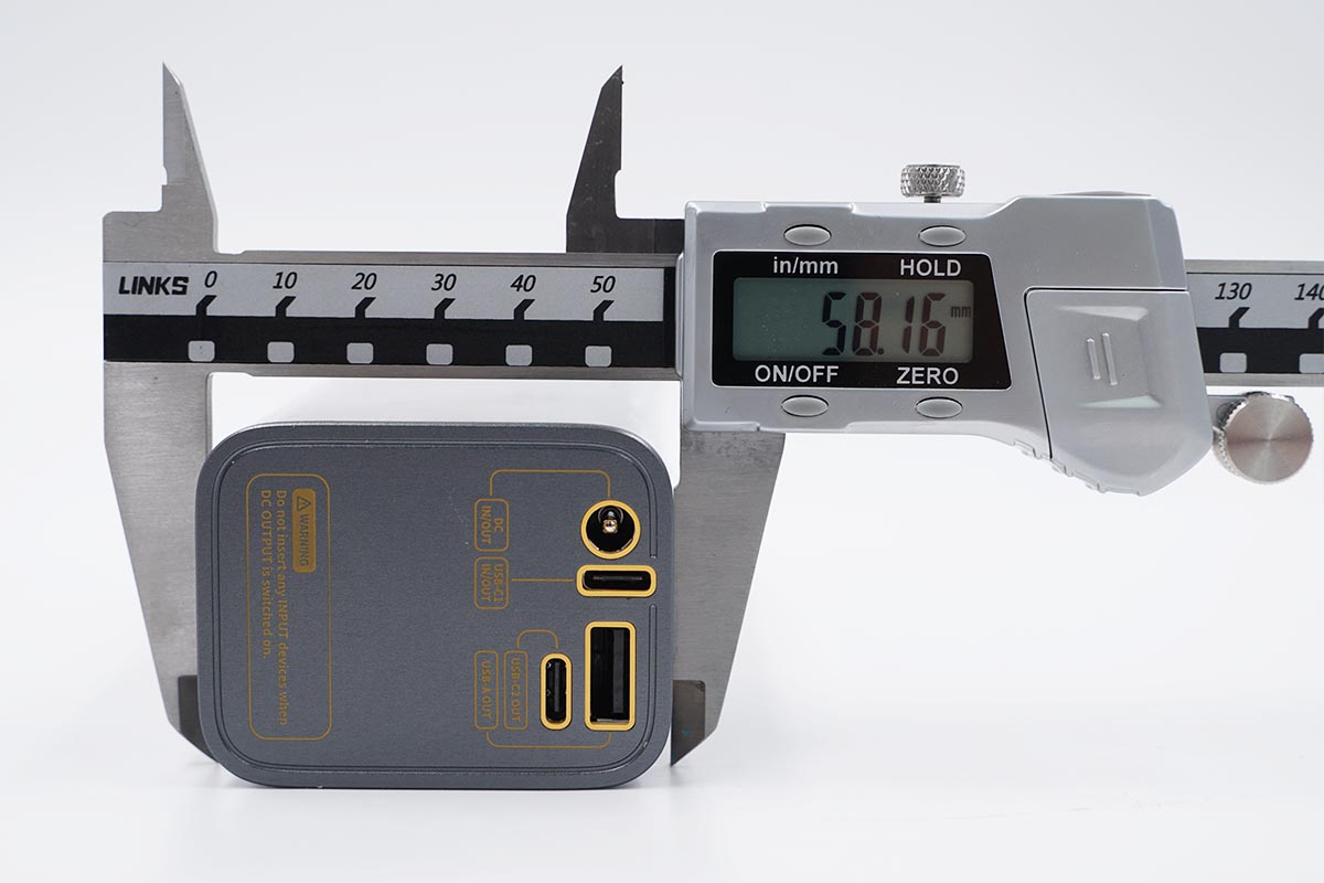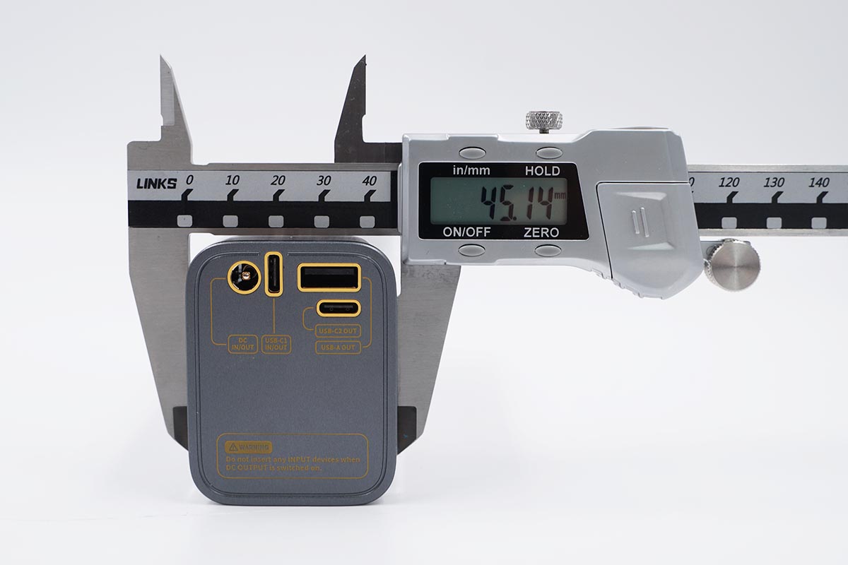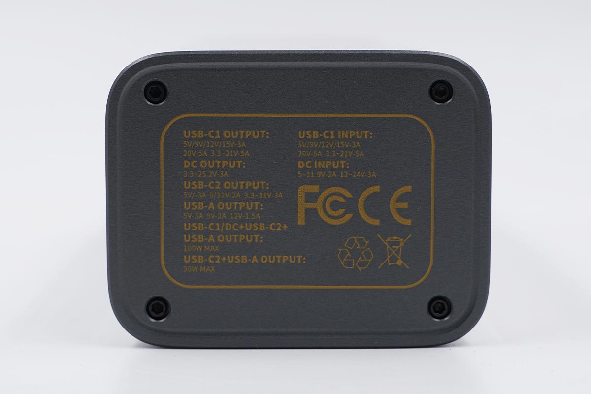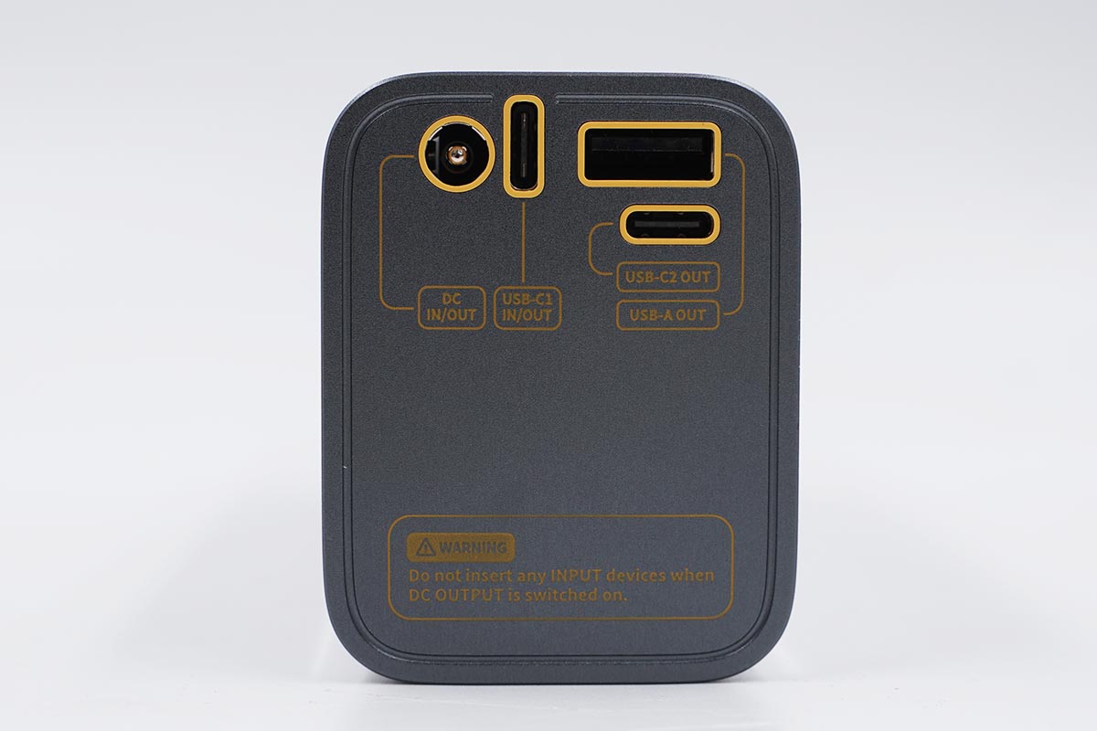 充電寶的接口則全部集中在側面,并使用黃色線圈勾勒出來,看上去非常的清晰明了。充電寶共配備了4個接口,分別是DC輸入/輸出接口、USB-C1輸入/輸出接口、USB-A輸出接口以及USB-C2輸出接口。