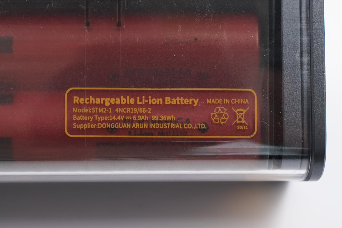 殼體的角落印制著產品的一些參數,充電寶的型號為STM2-1,電池能量為14.4V 6.9Ah 99.36Wh。中國制造。