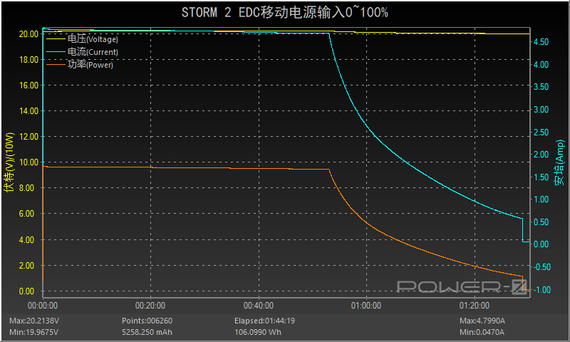 使用100W PD充電器為充電寶充電,連接充電器之后握手20V5A快充輸入檔位,53分前功率在96W左右,隨后功率和電流逐漸下降直至充電結束,全程耗時約1小時28分,最高功率為20.19V 4.76A 96.16W 。