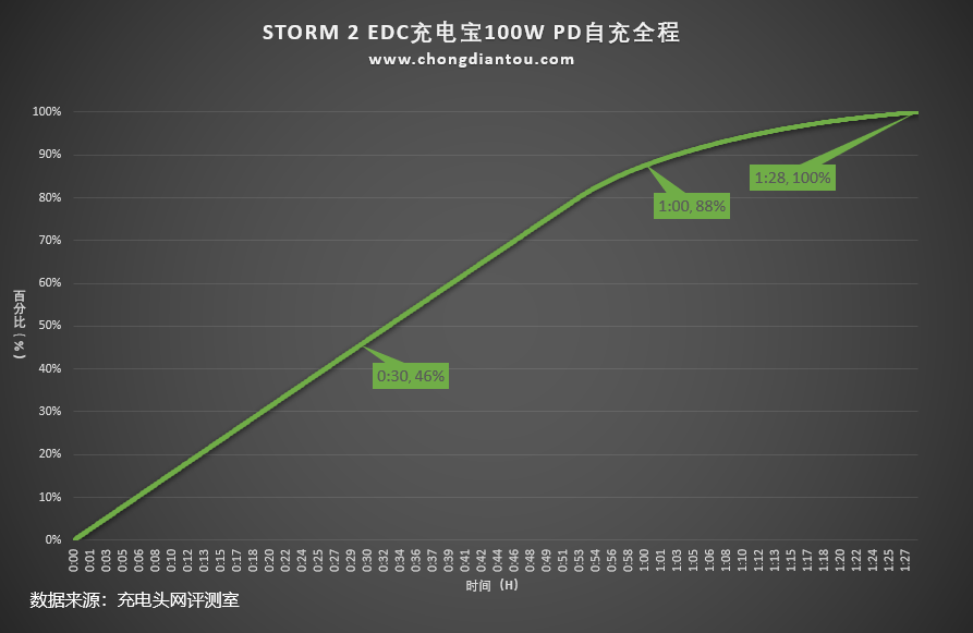 將自充全程繪制成曲線圖,可以看出使用100W PD充電器為充電寶半小時可以充電46%,1小時充電88%,完全充滿需要1小時28分。