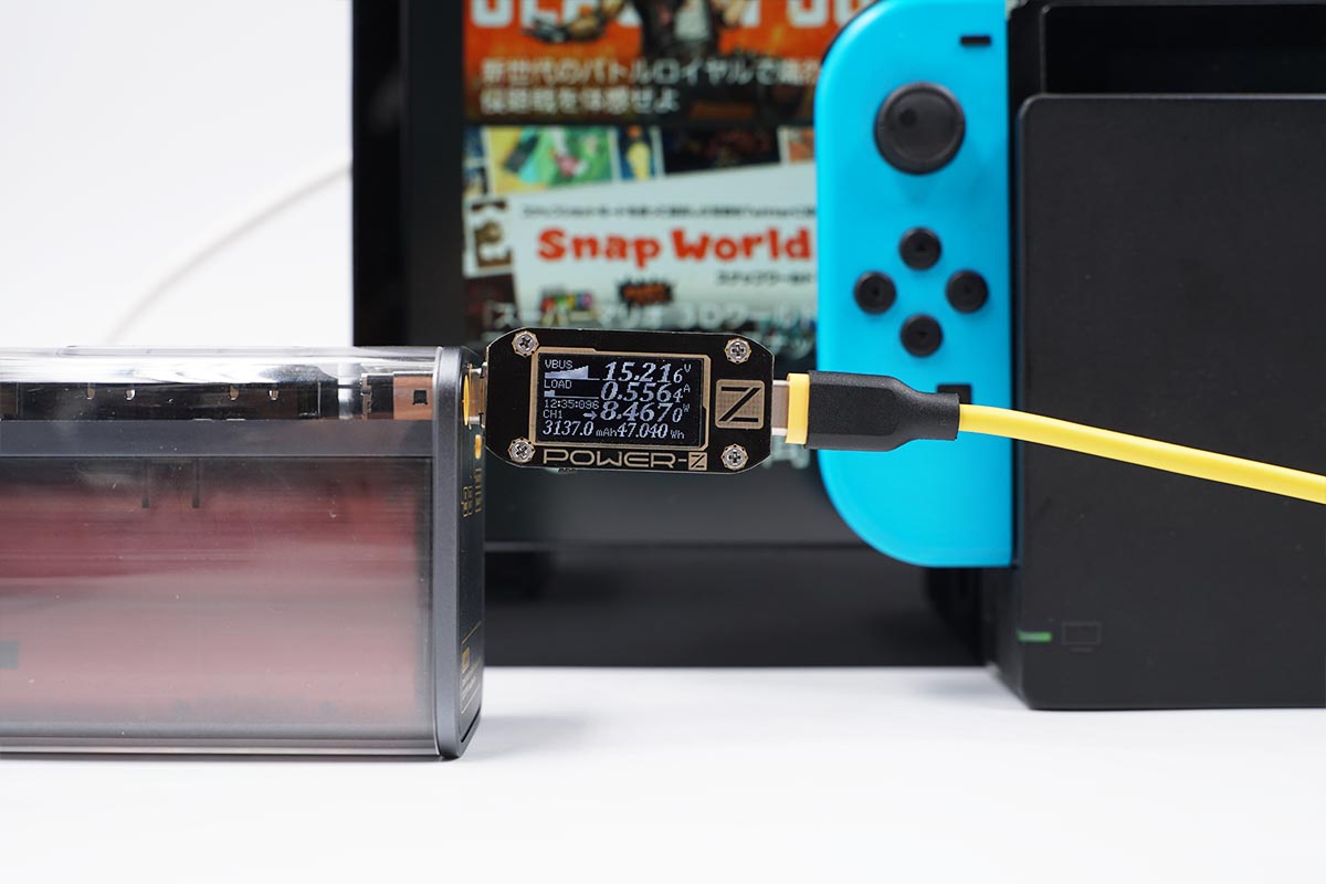 Switch帶有特殊的底座TV模式,需要15V3A PDO才可以正常工作,非常挑充電設備。使用USB-C1為Switch底座供電,功率為15.21V 0.55A 8.46W,成功握手底座TV模式,底座正常對顯示屏輸出HDMI信號。
