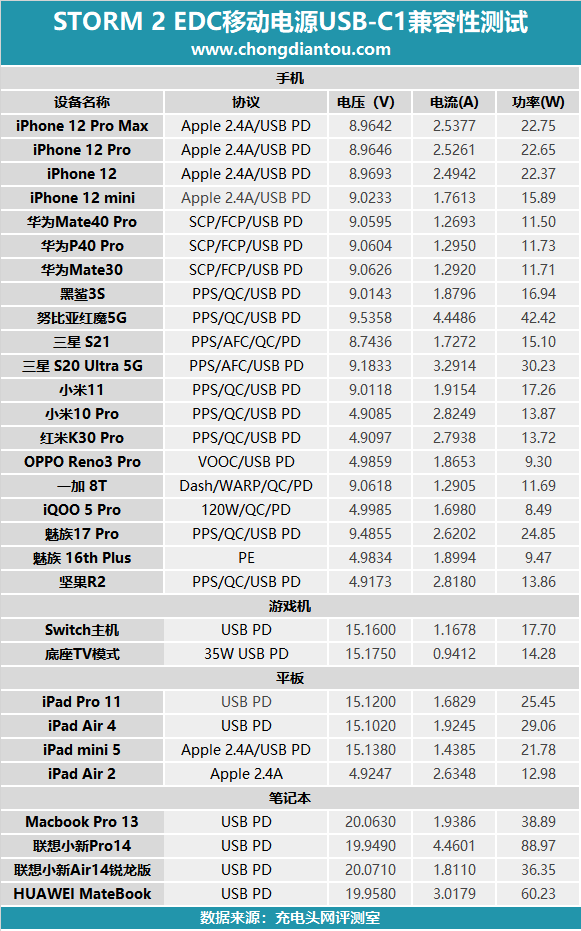 將USB-C1的測試數據匯總成表,整體上看為大部分設備充電均可以觸發PD快充,部分支持PPS大功率充電的手機也可以有30W-50W這樣的快充,只是在為小米10 Pro和紅米K30 Pro充電時功率在13W左右,為魅族16th Plus充電功率為9.47W。