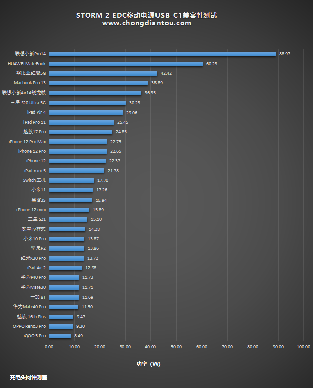 從整個柱狀圖來看聯想小新Pro14的快充功率最高,達到了88.97W,剩下的幾款筆電功率在36W-61W左右。觸發PD快充的安卓手機功率在11W-43W左右,蘋果設備的快充功率在12W-30W左右。
