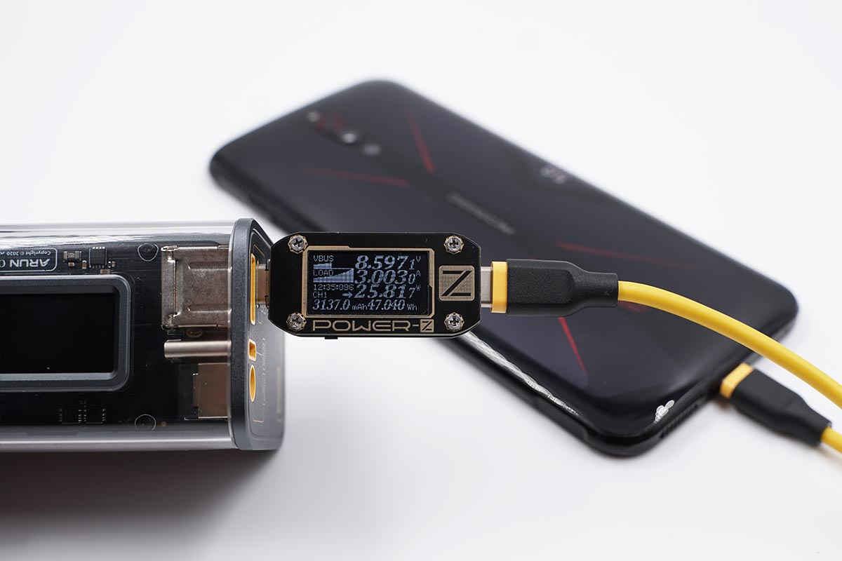 通過USB-C1為充電寶充電,同時使用USB-A為手機充電,充電器支持USB-C1輸入的同時USB-A輸出且均處于快充狀態。