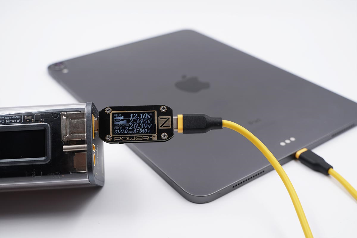 iPad Pro僅支持PD快充,使用USB-C2為iPad Pro充電,功率為12.10V 2.34A 28.39W,成功握手PD快充。