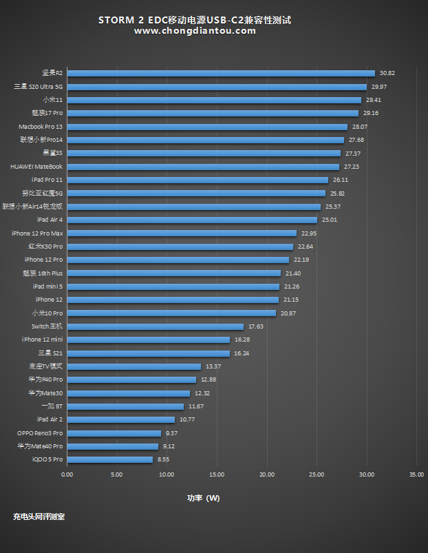 相較于USB-C1來講,USB-C2的快充柱狀圖走向較為平緩,堅果R2的快充功率最高,達到了30.82W,部分筆電和平板等大功率需求的設備功率在25W以上,一些不支持PD快充的手機功率較低,在10W左右。