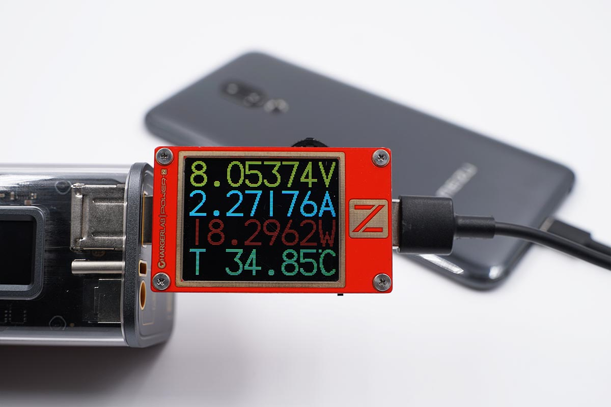 通過USB-C為充電寶充電,同時使用USB-C2為手機充電,實測充電寶支持USB-C1輸入的同時USB-C2輸出且均處于快充狀態。