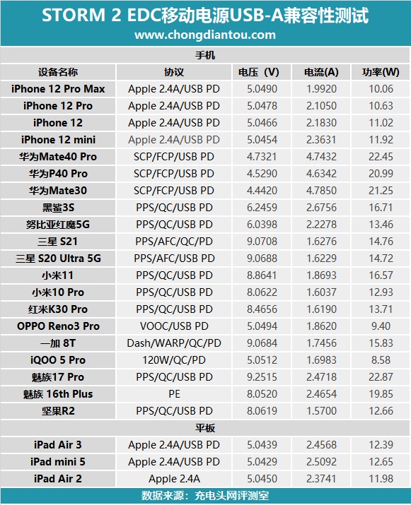 最后將USB-A的測試數據匯總成表,為蘋果設備可以提供Apple2.4A充電,為華為手機充電可以握手SCP快充,對于其他安卓機型則可以提供QC快充。