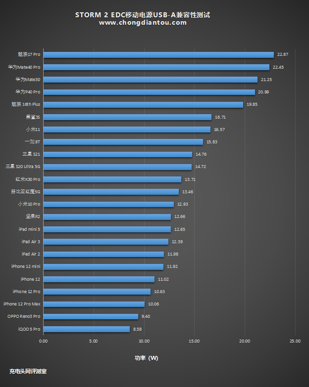 從整個柱狀圖來看,魅族17 Pro的充電功率最高達到了22.87W,華為手機的充電功率在20W以上,蘋果設備的充電功率在12W左右,觸發QC快充的安卓手機功率在12W-23W之間,而對于魅族魅族16th Plus也可以提供近20W的PE快充,表現不錯。