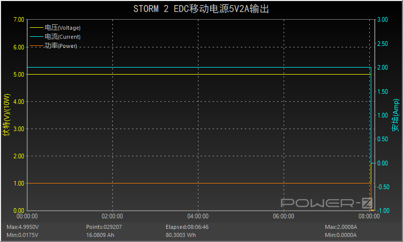 對充電寶的輸出效率進行測試,首先以5V2A 10W輸出功率進行測試,整個測試過程中三大數據平臺均持穩定的輸出狀態,全程耗時約8小時03分。放出的能量為80.3003Wh,所以充電寶在以5V2A檔位輸出時效率為80.3003/99.36=80.81% 。
