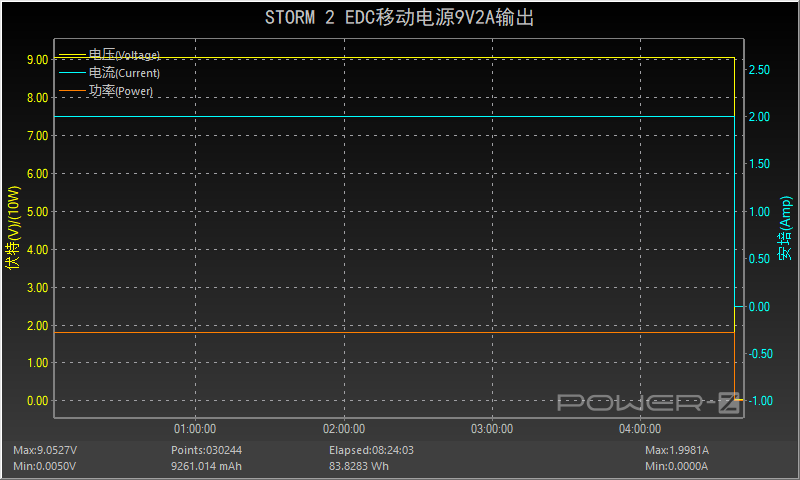 將功率升級至9V2A 18W,整個測試過程數據表現和5V2A相同,輸出非常穩定,全程耗時約4小時38分。放出的能量為83.8283Wh,所以充電寶在以9V2A 18W輸出時效率為83.8283/99.36=84.36% 。
