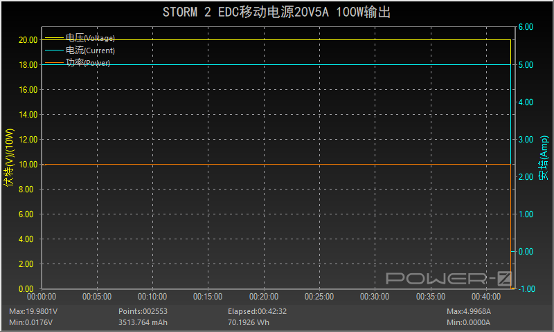 最后以20V5A 100W的功率對充電寶進行測試,和前兩次測試結果相同,輸出全程非常穩定,全程耗時約42分。非常的能量為70.1926Wh,所以充電寶在以20V5A 100W功率輸出時效率為70.1926/99.36=70.64% 。