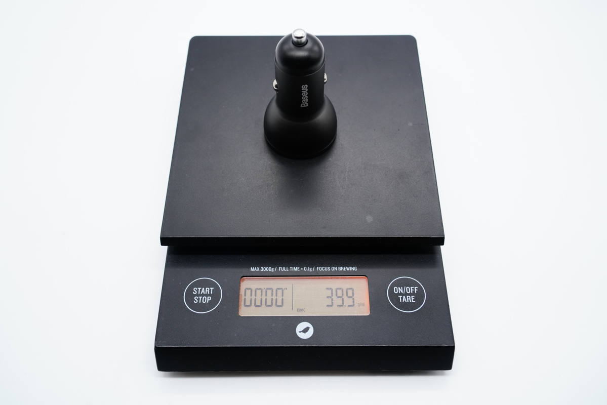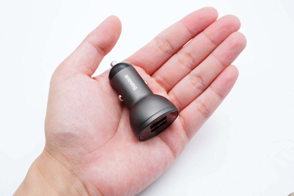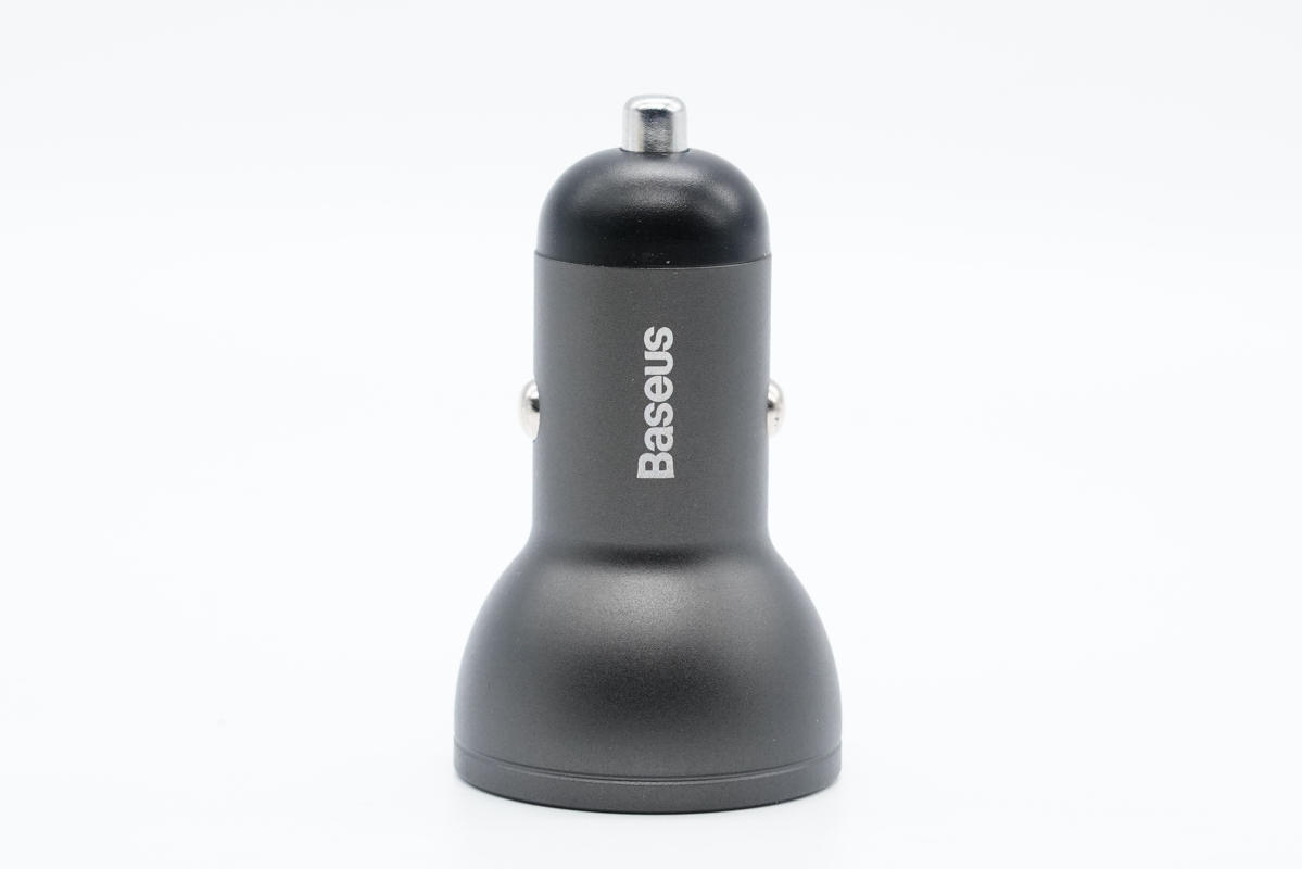 車充采用塑料加鋁合金外殼,金屬殼啞光灰色,機身流線型設計整體圓潤,正面印有Baseus品牌。
