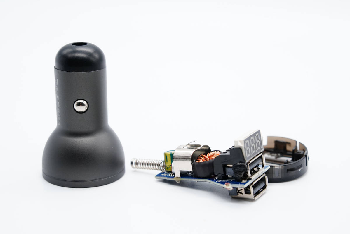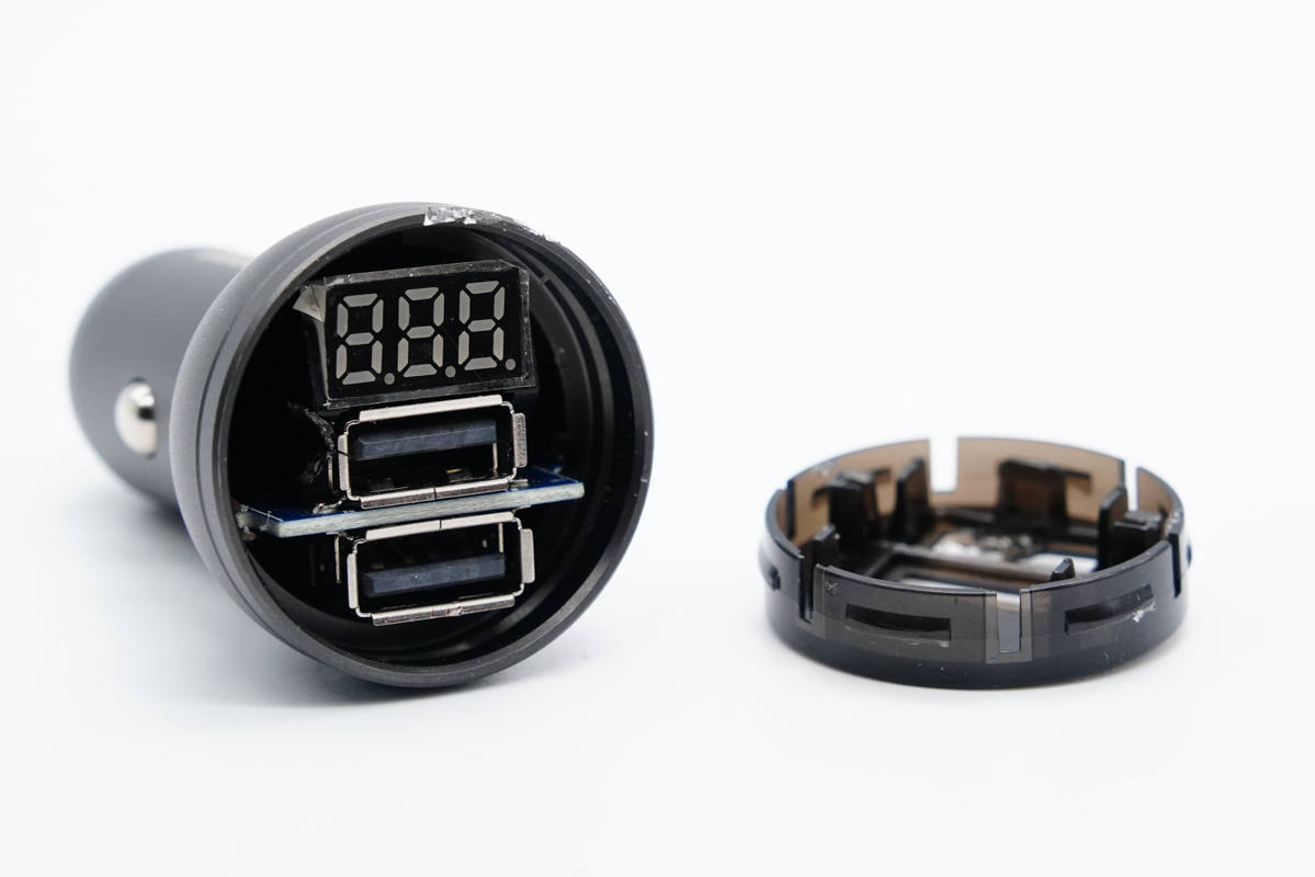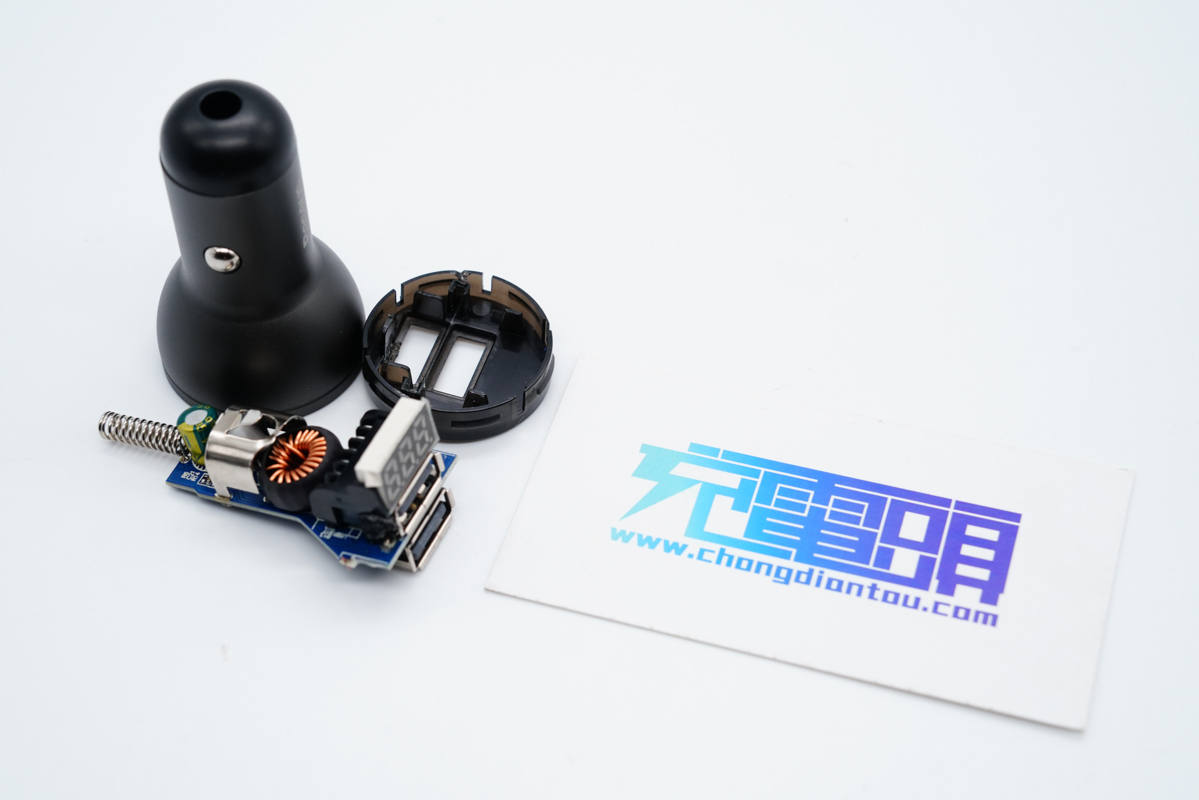 最近充電頭網拿到了倍思一款雙A口數顯車充,主體外殼為鋁合金材質,保護性強經久耐用。配備兩個USB-A口均支持5V2.4A輸出,可分別拿來給手機和行車記錄儀供電。下面我們就對這款車充進行拆解,看看其內部設計情況。