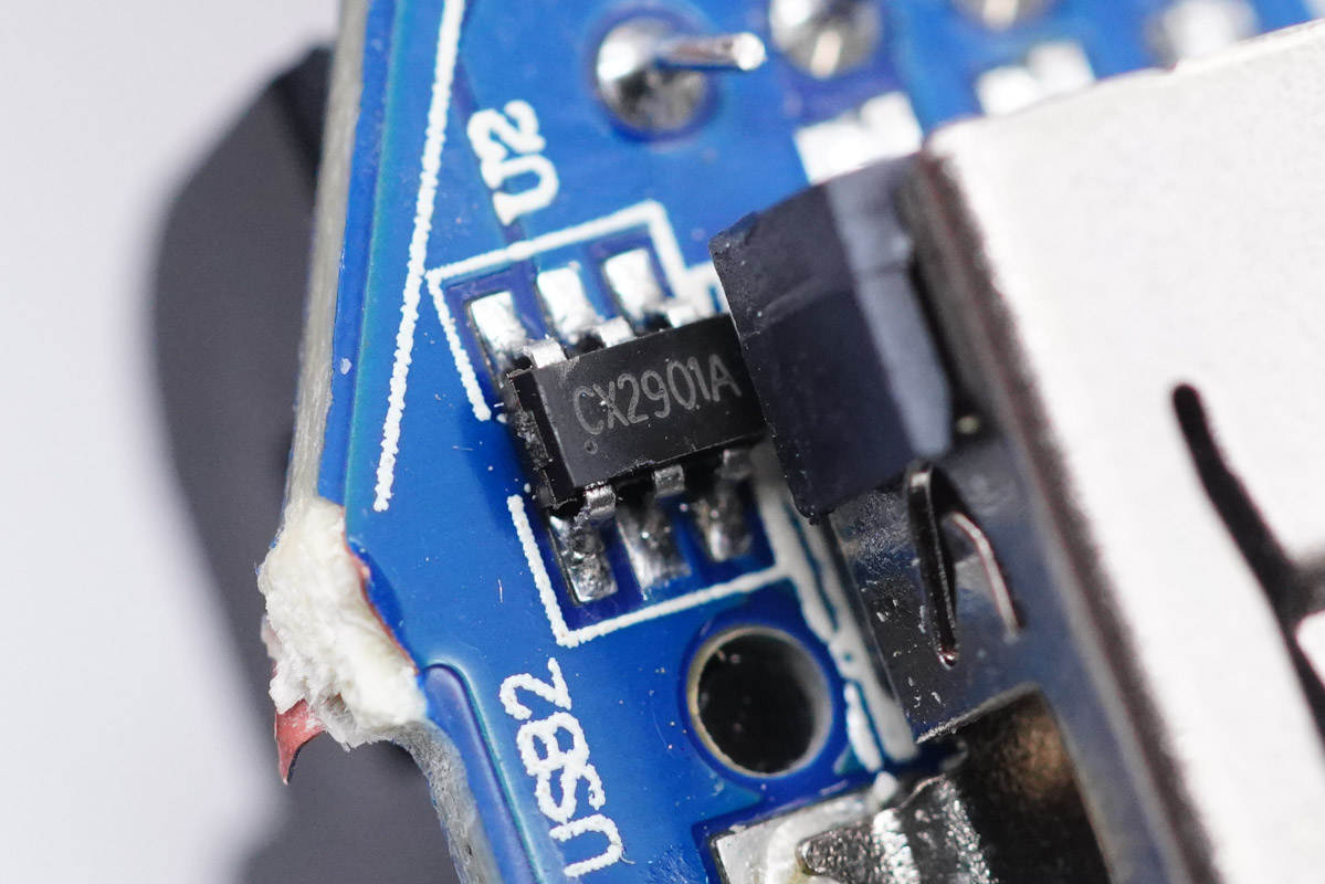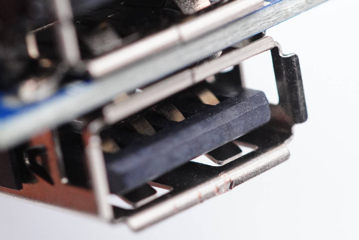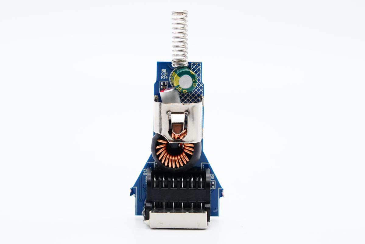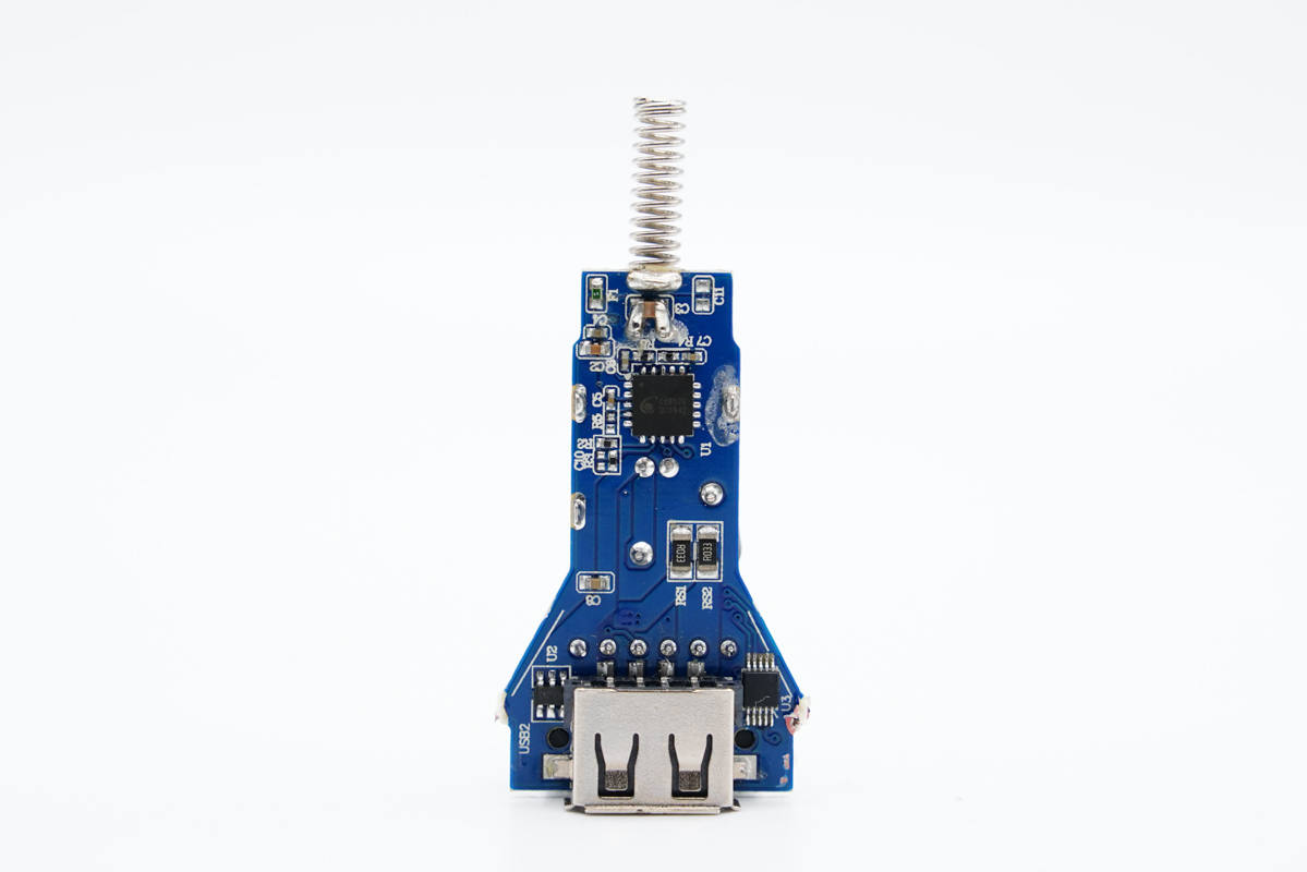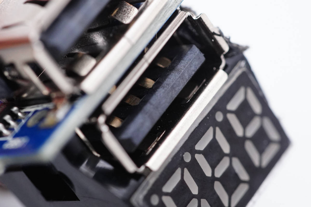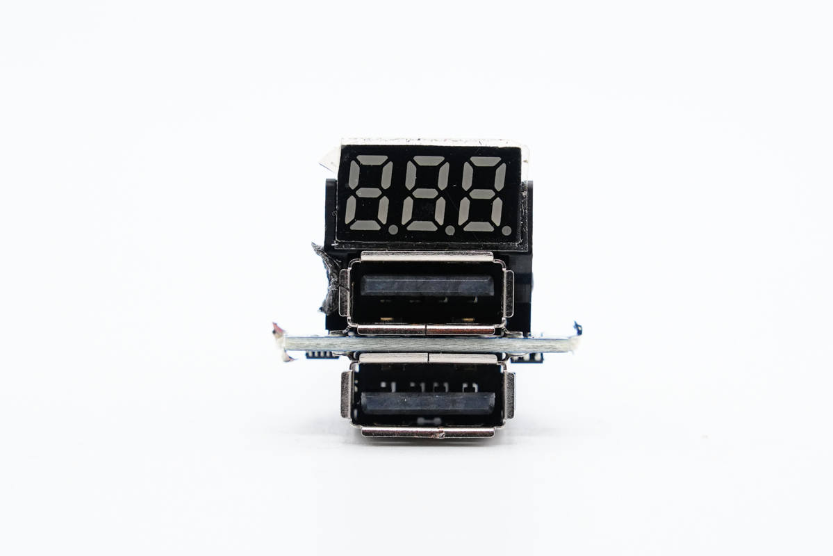 輸出端兩個USB母座焊接在主板兩面,LED屏和母座之間有塑料隔離。