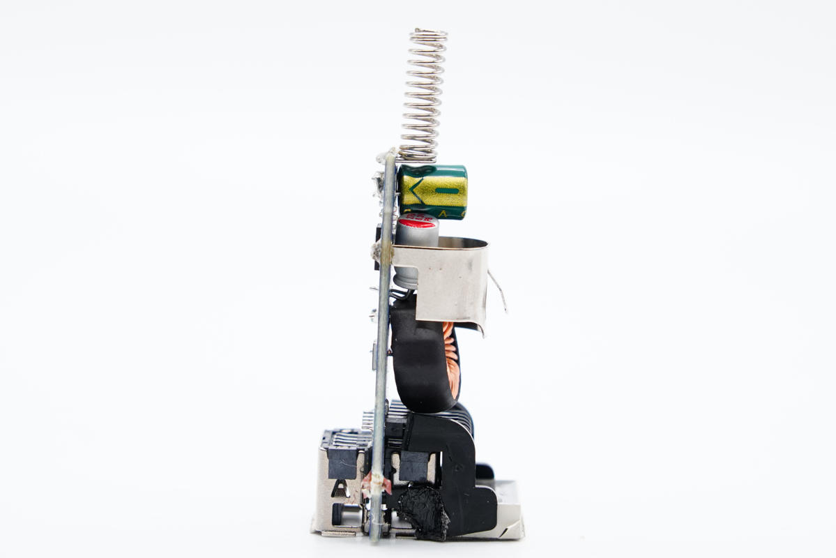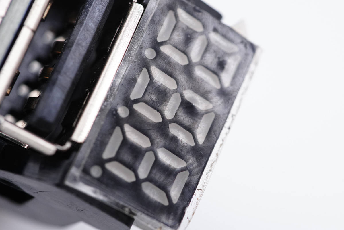 從側面看去,負極金屬片和PCB板錫焊,LED顯示屏使用塑料支撐加固。