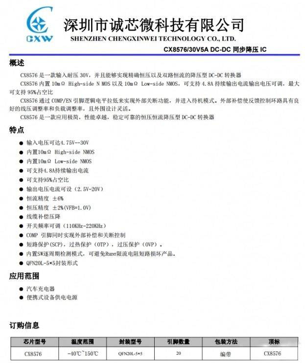 輸入降壓轉換器采用誠芯微CX8576,這是一款輸入耐壓30V,并且能夠實現精確恒壓以及雙路恒流的降壓型DC-DC轉換器。CX8576內置10mΩ High-side N MOS以及10mΩ Low-side NMOS,可支持 4.8A持續輸出電流輸出電壓可調,最大可支持95%占空比。