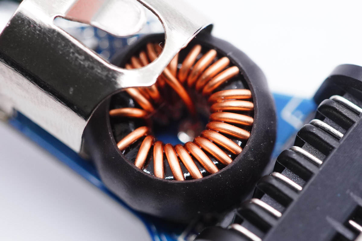 PCB板正面一覽,使用輸入輸出濾波電容、降壓電感。