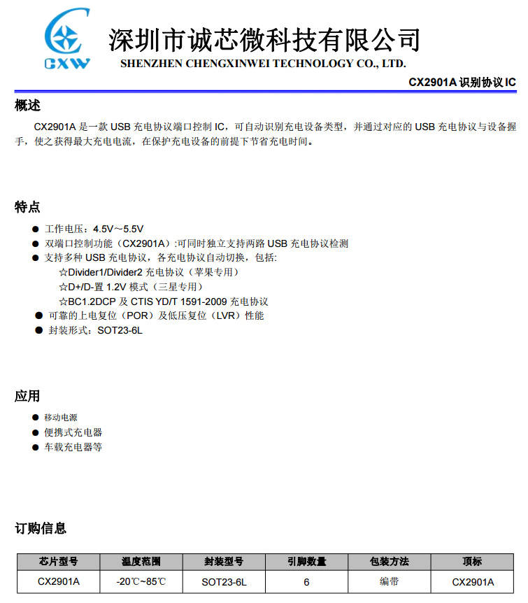誠芯微CX2901A雙路自動識別IC。這是一款USB充電協議端口控制IC,可自動識別充電設備類型,并通過對應的USB充電協議與設備握手,使之獲得最大充電電流,在保護充電設備的前提下節省充電時間。